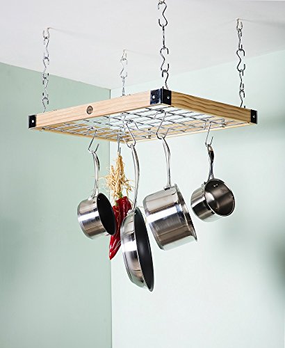 Description : Hahn Classic Square Ceiling Rack Natural Pine with Chrome HooksEqually suited to a country-style kitchen or a sleek stainless steel cook's haven, and brilliant for anyone who has an island unit in the centre of their kitchen, this gridded hanging rack comes with a dozen S-shaped 'butcher's' hooks to help you hang pans, utensils, herbs or even strings of onions, garlic or salami.Part of Hahn's Classic range the frame of the pan rack is made from natural pine with sleek chromed corners and is provided with 12 aluminium hooks to hang from the central grid. It comes with a 5 year manufacturer's warranty.Easy to assemble with fixings included, the height is simple to adjust with strong, open-sided links that just hook together to form chains from 7cm up to 56cm long. Please note: the ceiling fixings must be secured firmly to a substantial structure such as a beam or joist. About HahnSpecialists in barware, giftware and kitchen storage, and offering the widest range of wall and ceiling racks...