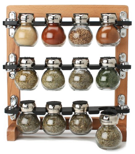 Description : European beechwood spice rack 12 3oz glass jars filled with a range of spices Glass jars have a unique flip lid for easy pouring or shaking of spices Each jar comes filled with a different spice Spices included are subject to change Box Contains Olde Thompson 12 Jar Wooden Spice Rack