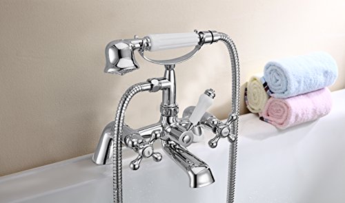 Description : The Stafford Victorian Bath Shower Mixer is perfect for adding a traditional and classical touch to any bathroom. The hot and cold symbols on the taps create a vintage effect and are ideal for keeping in consistency with a traditional themed bath room. The bath shower mixer comes with a top quality shower head, with an easy to use lever to turn the shower head on. These bath shower mixers are perfect for coordinating a shower head and bath filler together instead of buying them separately, which saves you the hassle of doing so. The Stafford bath shower mixer is made from a high quality solid brass and is polished in a flawless chrome finish, ensuring you a good quality product. The tap has quarter turn handles: the hot turns clockwise and the cold turns anti clockwise. They also come with a 10 Year Warranty for peace of mind. Please note that the guarantee is only valid for uktapstores items only. Please note: Clockwise to turn Hot Tap on, Anti-clockwise to turn Cold Tap on.