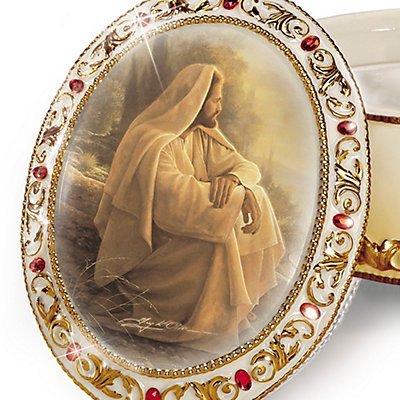 Description : Your faith is a source of strength and comfort each day. Now you can display a reminder of the power and presence of God with this classically styled religious music box. This meaningful music box features widely sought art by acclaimed biblical artist Greg Olsen. The portrait, faithfully captured on the lid, showcases Christ sitting on a hilltop, gazing over Jerusalem at dawn. The Jesus art is lovingly framed by 12 sparkling, simulated jewels and rich, golden scrollwork. You'll appreciate the attention to detail on this Bradford Exchange exclusive music box that is created specially by highly skilled artisans under the hallmark of Longton Crown Pottery. It's handcrafted in hand-glazed, hand-fired Heirloom Porcelain with resplendent golden feet for added elegance. With the simple turn of a key, you'll hear the moving melody of 'The Lord's Prayer'. It comes with a lovely prayer card with The Lord's Prayer - yours FREE. Strong demand is expected for this limited edition Christian religio...