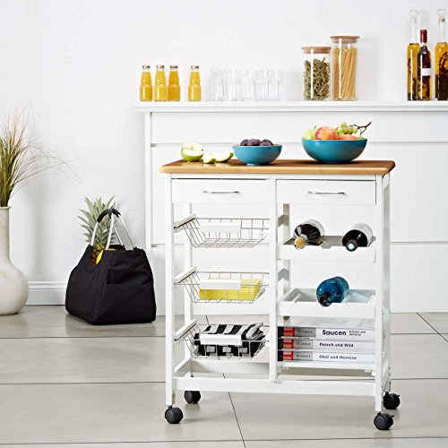This kitchen trolley is the perfect aid in any kitchen and can be used for preparation, serving or transporting. The 2 draws, 3 removable metal baskets, 2 surfaces and 1 bottle storage point for 3 bottles offer plenty of storage space for smaller household goods, plates and cutlery, fruit, vegetables and (wine) bottles. Whether barbecuing on the terrace, serving in the dining area or as an extra work surface in the kitchen, the 4 wheels (2 of which have brakes) enable easy movement and flexible use. This multifunctional furniture item in white with work surface in a bamboo look, skilfully integrates into all kitchens and creates a homely and harmonious ambience. The sturdy construction and sound workmanship is defined with clear...