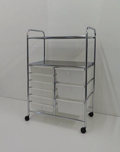 - 9 frosted white plastic Drawers:Overallsize:63x39x96.5CM. 4 Wheels for easy moving(with 2 brakes).
