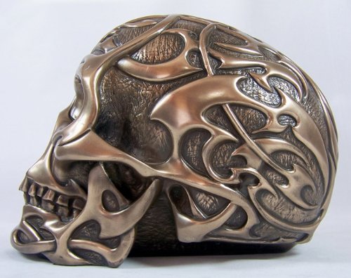 Description : Bronze Tribal Skull is a HUGE skull designed by Seamus Moran, co founder of the 'Design Clinic'. This bronze sculpture is magnificent and cast from an original design clinic sculpture in cold cast resin bronze Measures 20cm by 14cm by 12cm and weighs aroudn2kg which will give you a better idea of the size and quality. In the artists own words: "The style of pattern on this skull is altogether more tattoo-like in its form, with hints at the more traditional celtic style but with a more modern, fluid, "tribal"feel. I really wanted to apply shapes which would flow with the natural curves of the skull and complement the bone structure.The patterns themselves have a more rounded cross-section making the tactile experience unlike any of the other skulls in the range.It simultaniously suggests waves and flames, and has a slightly more scary look than the others in the range." Seamus Moran Made from solid cold cast bronze with a fantastic quality finish